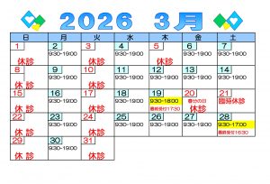 2026年3月の診療日カレンダーを公開しました。